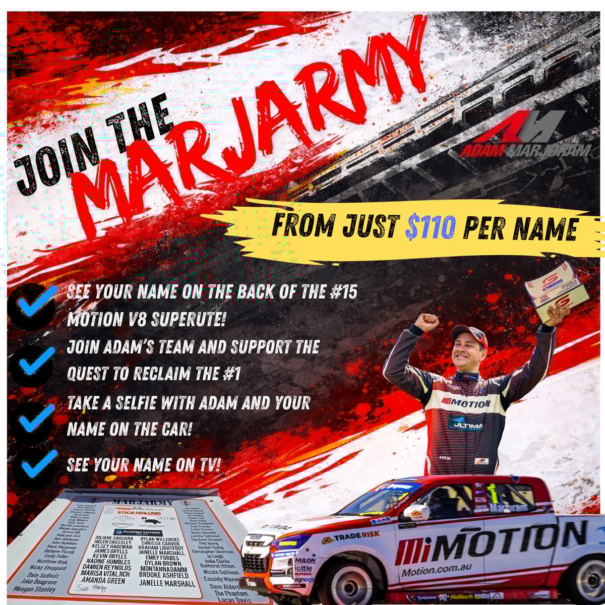 Support Adam Marjoram as he fights to reclaim the #1 title in the 2026 Tyrepower V8 SuperUte Series. Secure your spot on the #15 Motion V8 SuperUte—get your name on the hardlid and watch it tear up the track live or on TV. Plus, you’ll get the exclusive chance to grab a selfie with Adam and your name on the car during the season!